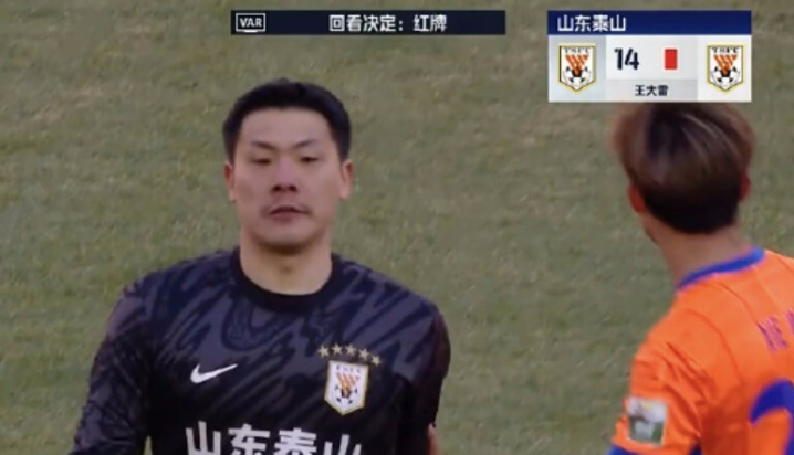 这一幕发生在比赛第23分钟,河南队长传发动反击,在两位队友已经夹防河南队前锋刘鑫瑜的情况下,王大雷依然贸然冲出禁区,他的解围没踢到球,反而踢翻刘鑫瑜。随后主裁杜健鑫查看VAR,将王大雷直红罚下。年仅20岁的替补门将于金永登场,换下谢文能,为泰山守门。